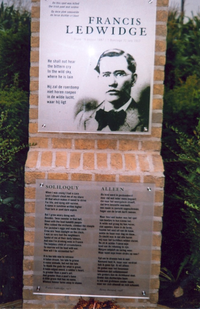 And an Irish tricolour, fluttering in the breeze above a memorial at a road junction just outside the village of Bozinge on what was the First World War battlefield of Pilckem Ridge, Flanders, proclaims the memory of a highly talented but little known (at least on this side of the Border) Irish poet Francis Ledwidge.