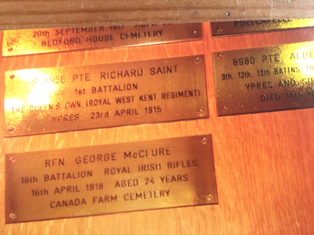 I’ve probably been at the Menin Gate up to 20 times, usually with a relative or two, after we making our annual visit to my great uncle’s grave at Canada Farm cemetery about three miles from the town. The name of Rifleman George McClure from Moira, County Down is also one of the few Northern Ireland servicemen commemorated on a brass plaque just inside the door of St George’s Church in Ypres, a hundred yards or so down the street from the Commonwealth War Graves Commission’s office.