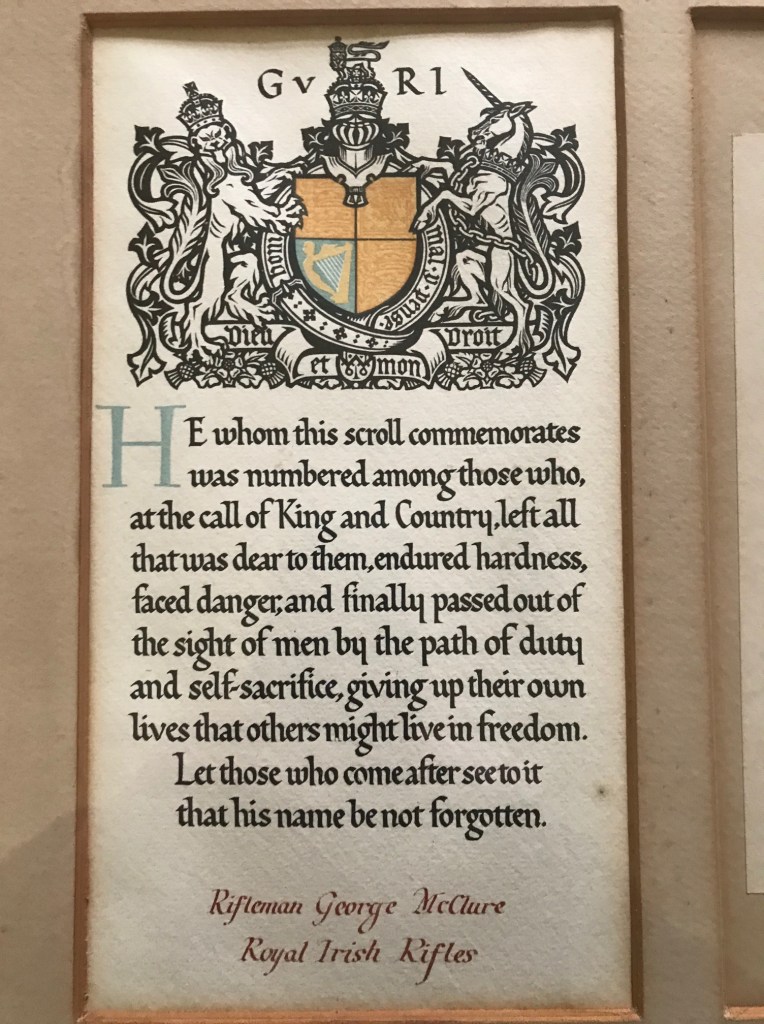 Apart from a framed scroll from the King expressing his condolences which hung proudly on my granny’s living room wall, George McClure’s death in WWI had been something of a mystery. The family in fact thought that he had died at the Somme, but it turned out he had survived the great but disastrous Somme offensive and actually died towards the end of the War, in what was the Germany army’s final push around Ypres in Belgium.